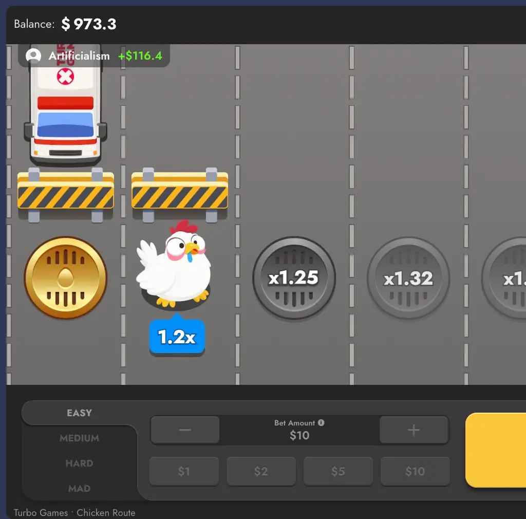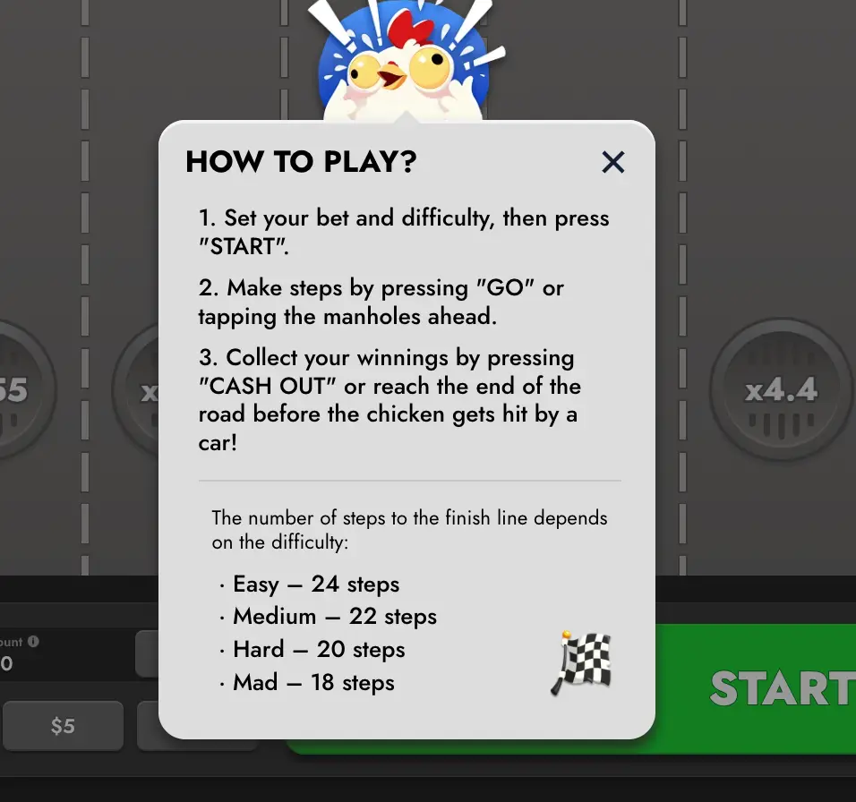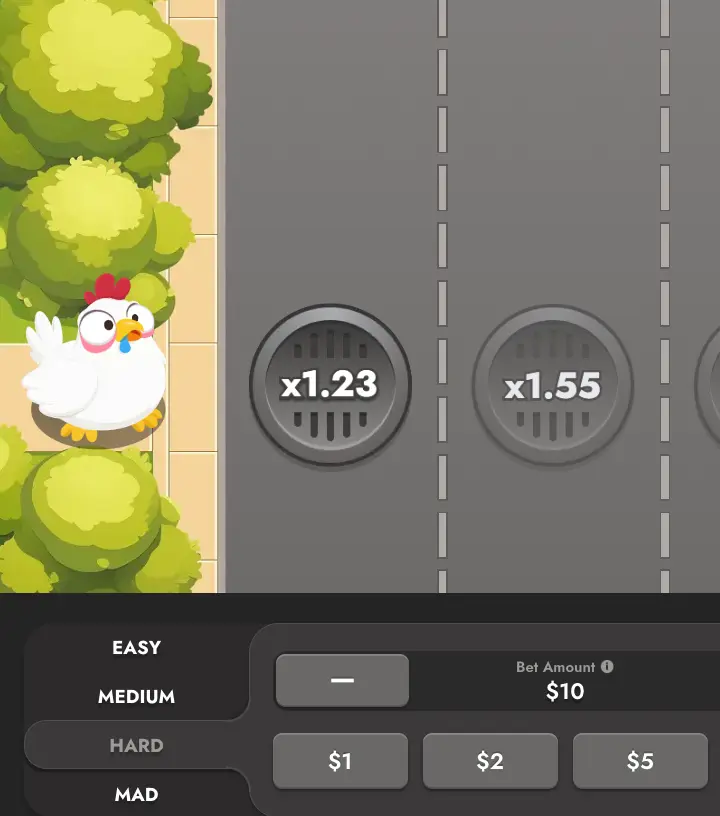 Концепция игры чрезвычайно проста: игрок наблюдает, как отважная курочка пытается пересечь оживленную дорогу. Каждый успешный шаг увеличивает множитель выигрыша, но опасность нарастает с каждым движением. Ваша задача — решить, когда забрать выигрыш, пока курица не попала под колеса транспорта.