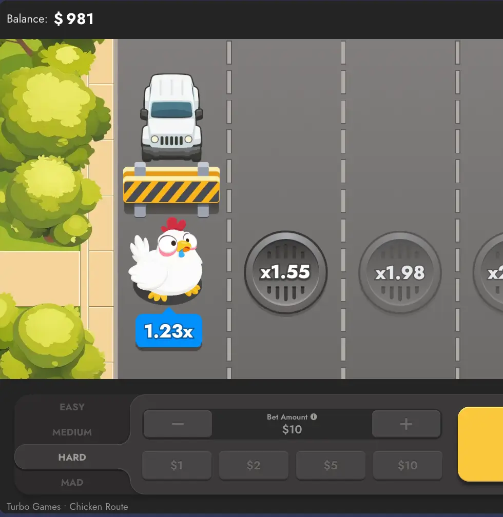 Chicken Route Turbo Games — это захватывающий краш-слот от провайдера Turbo Games, который превращает классическую идею "почему курица перешла дорогу" в динамичную казино-игру с мгновенными выплатами. Эта игровая механика сочетает простоту, напряжение и потенциал для значительных выигрышей.